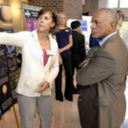 NASA chief administrator Charles F. Bolden Jr. speaks with Purdue graduate student Amanda Haapala on Tuesday inside Armstrong Hall in West Lafayette. Haapala's research involved multibody dynamics.