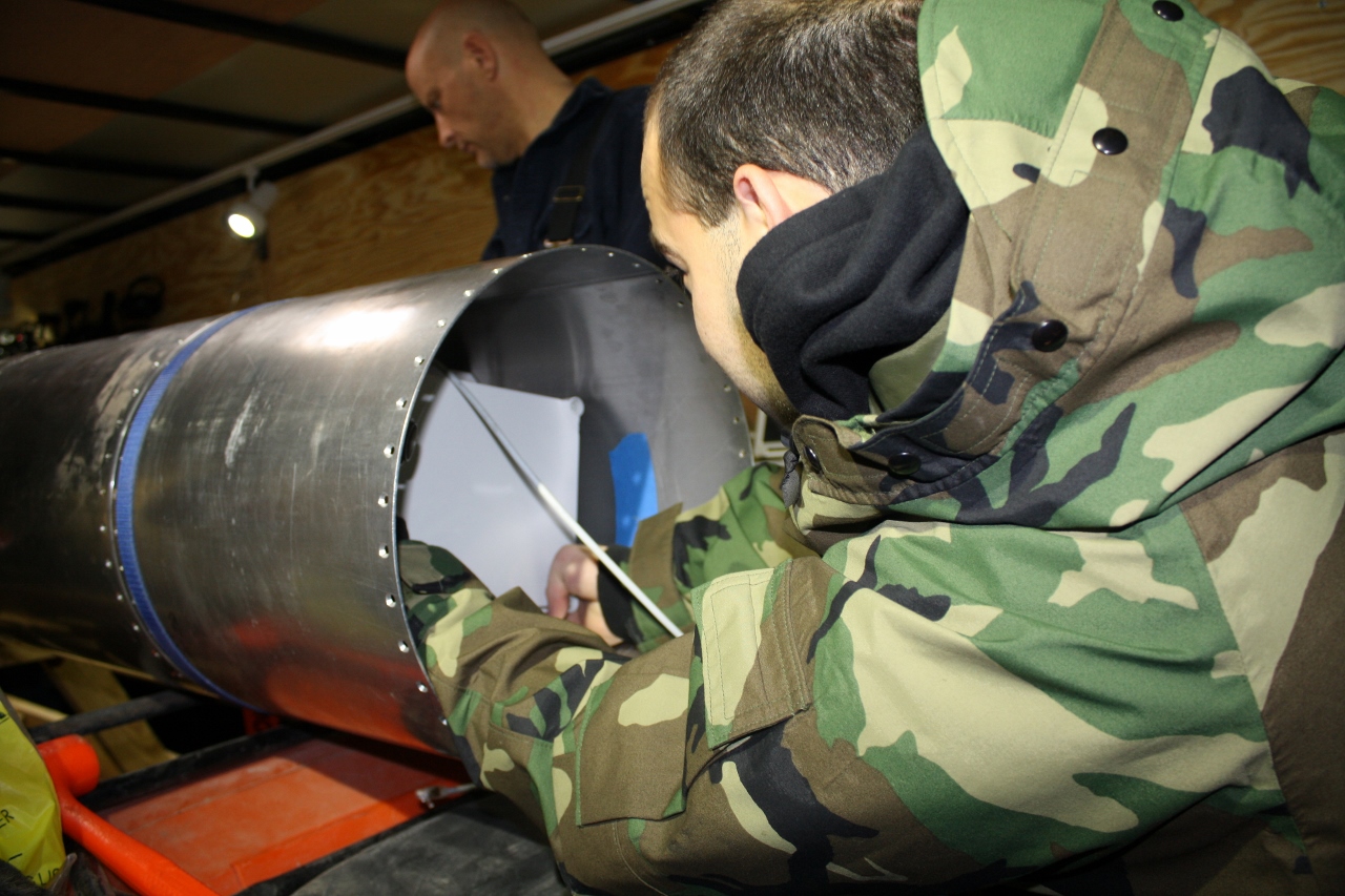 Top ~ Sam Rotella performing fit-check of Purdue SPEAR-3 experiment in the Armadillo STIG A rocket. Saturday Dec. 3, 2011