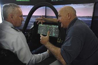 Left - Lockheed Martin instructor pilot Stormy Boudreaux highlights capabilities of the F-35 Lightning II integrated multifunction display to Gen. Bruce Carlson, Air Force Materiel Command commander. The stealthy Joint Strike Fighter was designed to provide its pilot with unsurpassed situational awareness, positive target identification and all-weather precision strike capability. Aeronautical Systems Center at Wright-Patterson oversees U.S. Air Force acquisition and program management support for the F-35, which is projected to reach initial operational capability for the U.S. Air Force in 2013. (U.S. Air Force photo/Al Bright)