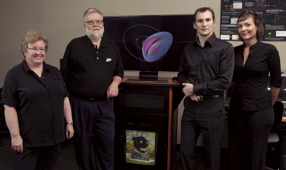 NASA’s Planetary Protection Office chose a team of Purdue University researchers to evaluate if a sample from the moon Phobos could contain enough material from Mars to include viable Martian organisms. The Purdue team stands with an image of possible particle trajectories from an asteroid impact. Standing from left are Professors Kathleen Howell and Jay Melosh, and graduate students Loic Chappaz and Mar Vaquero.