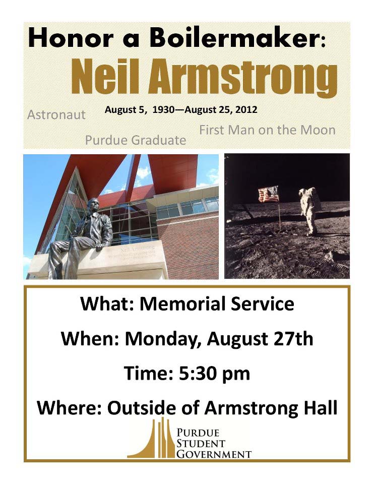 Purdue Student Government will be holding a Memorial Service for Neil Armstrong on Monday August 27, 2012 at 5:30 p.m. outside Armstrong Hall.