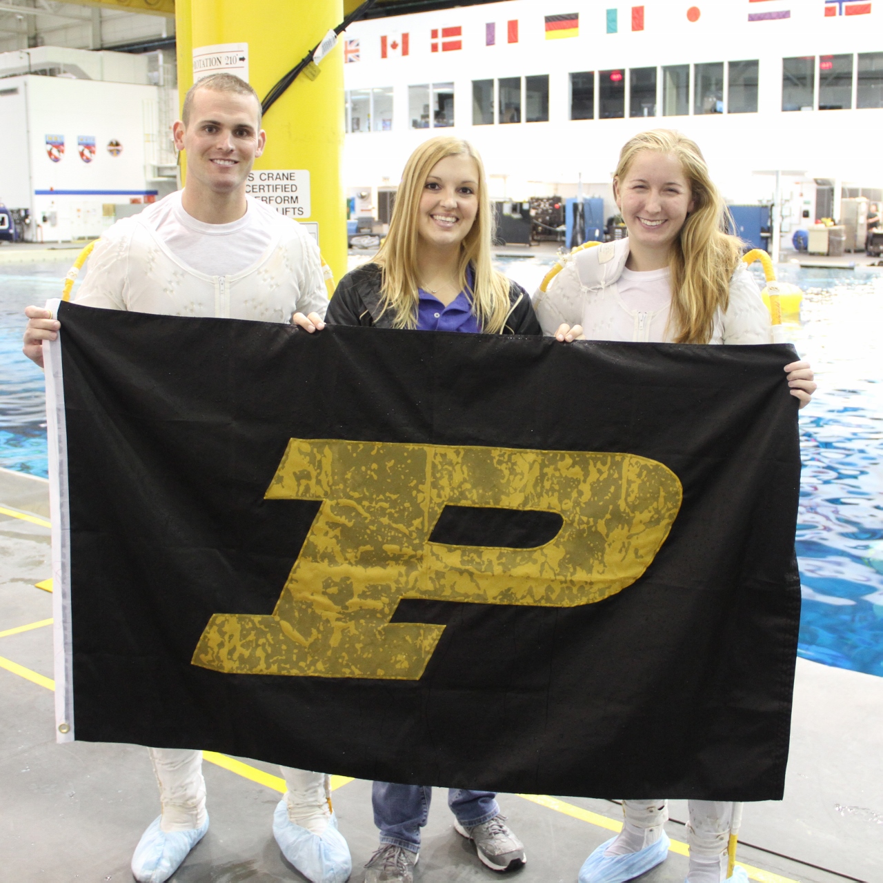 Allissa Battocletti BSAAE’11, who is a member of NASA’s EVA Operations team, took the opportunity to fly the Purdue flag during her rotation as instructor for NASA’s Neutral Buoyancy Laboratory (NBL).