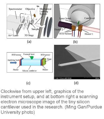 The researchers used the technique to study microscale silicon cantilevers, tiny diving-board shaped slivers about 7 microns thick, or roughly one-tenth the thickness of a human hair, and 225 microns long. The cantilevers were heated and stressed simultaneously. Surface stresses at the micro- and nanoscales were measured for the first time in conjunction with temperature change and a structure's deformation.