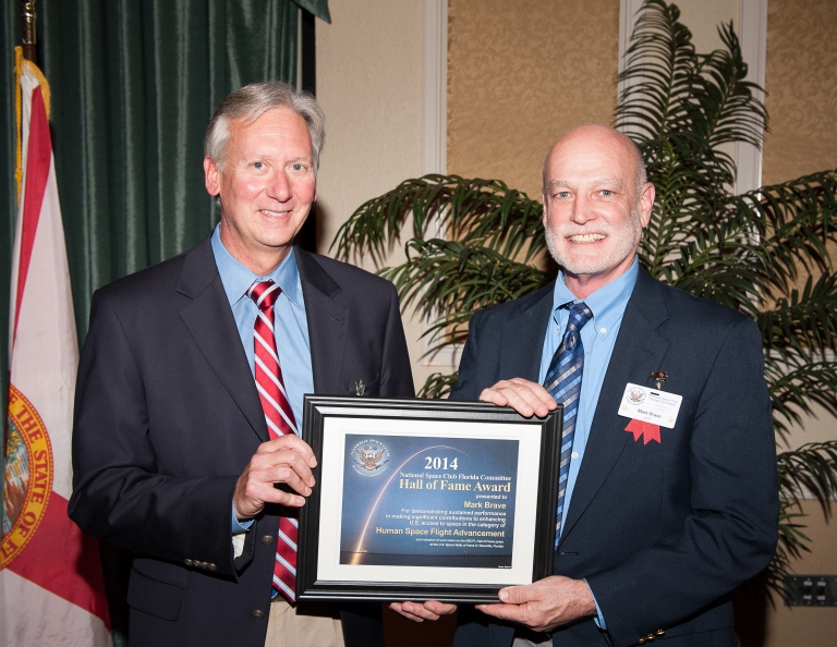 Photo, above: Mark Brave (right) receives National Space Club Florida Committee 2014 Hall of Fame Award.