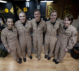 pictured from left to right: Air Control Officer Lt. Nydia Williams, left, Radar Operator Lt. j.g. Ashley Ellison, Plane Commander Lt. Cmdr. Tara Refo, Pilot Lt. Ashley (Ruic) Faires, and Mission Commander Lt. Cmdr. Brandy Jackson, all assigned to Carrier Airborne Early Warning Squadron (VAW) 125, pose for a photo before flying the first all-female-crewed combat mission in an E-2C Hawkeye aboard the Nimitz-class aircraft carrier USS Carl Vinson (CVN 70). Carl Vinson and Carrier Air Wing (CVW) 17 are deployed to the U.S. 5th Fleet area of responsibility. (U.S. Navy photo by Mass Communication Specialist 2nd Class James R. Evans/Released)