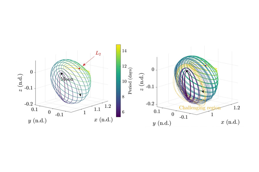 Work done in recent decades has made it a relatively well-known process to operate and launch satellites into low Earth orbit (LEO), enabling a boom in commercial space operations. But other factors come into play further out, where Earth’s gravity becomes less dominant. “In LEO there are certain characteristics that govern spacecraft motion, and catalogs are built upon these characteristics. The use of the same characteristics may no longer be a complete approach to represent many of the trajectories in the cislunar region and XGEO,” says Howell.