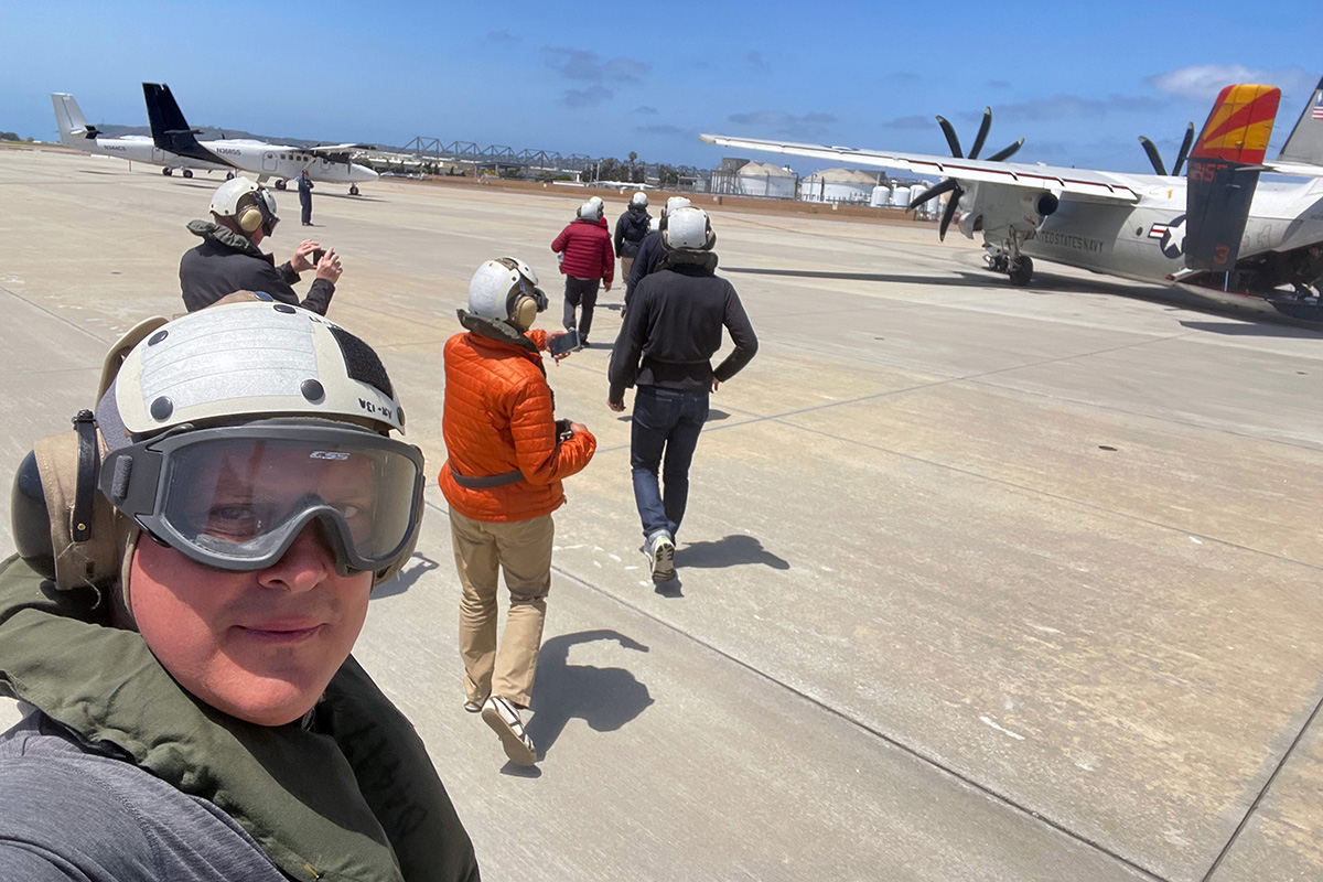 “Standing 5 feet from a taxiing F-18 and about 50 feet from a catapult launch on afterburners is AMAZING. I never expected I would have that opportunity in my life,” says AAE professor Tim Pourpoint.