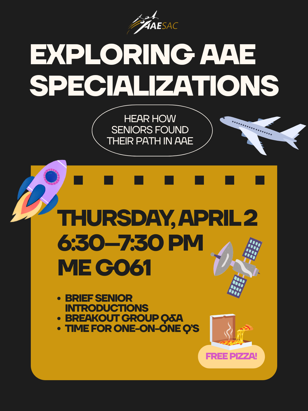 AAESAC is hosting an AAE specializations info session this Thursday (04/02) from 6:30–7:30 PM in ME G061!