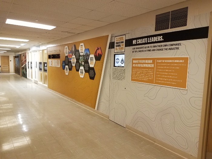 First, our main hallway got a significant upgrade. We introduced a floor to ceiling hallway graphic that showcases many ways civil engineers make an impact on the world. Additionally, it highlights aspects of our school and program for current and prospective students and families. You can view the time lapse of a portion of the wall wrap work here.