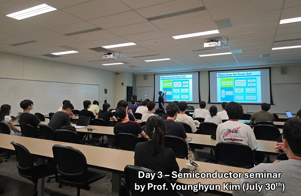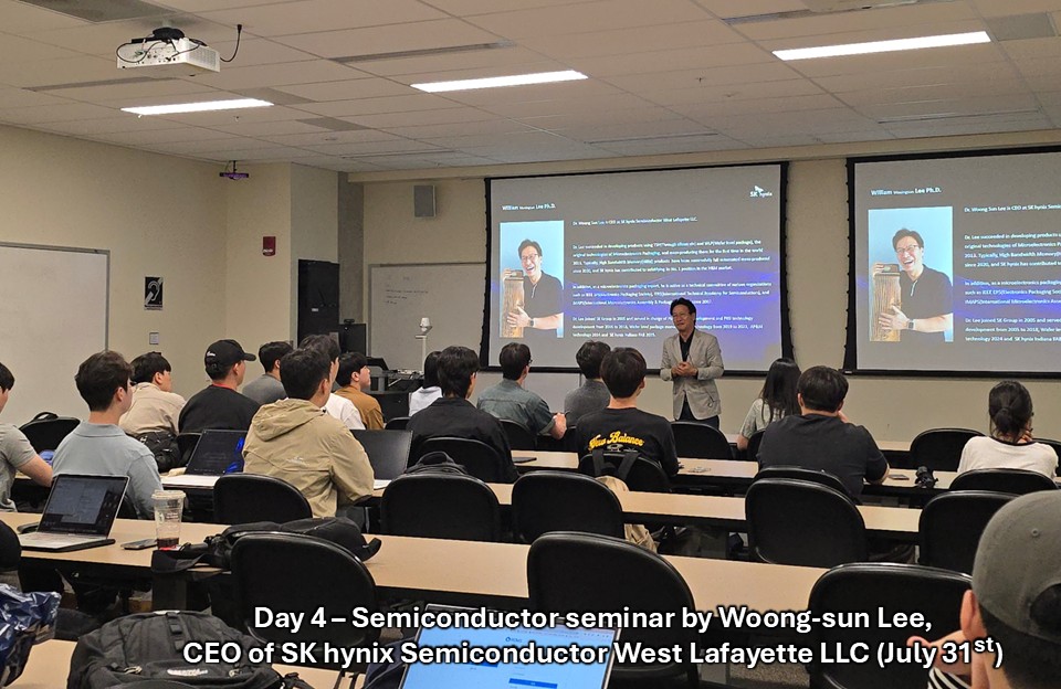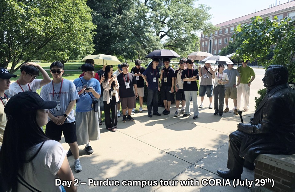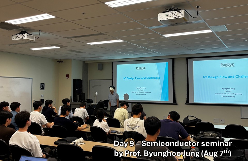 The program was facilitated by Prof. Martin Byung-Guk Jun, Director of Purdue’s international cooperation center CORIA (GITCC-CORIA), and Dr. Hyunmin Park, who supported overall program coordination and organized social activities (Day 1 and Day 6) as well as a campus tour (Day 2). Purdue faculty also contributed: Prof. Younghyun Kim, Associate Professor of Electrical and Computer Engineering (Day 3), and Prof. Byunghoo Jung, Professor of Electrical and Computer Engineering (Day 9), delivered seminars on semiconductor-related topics.
