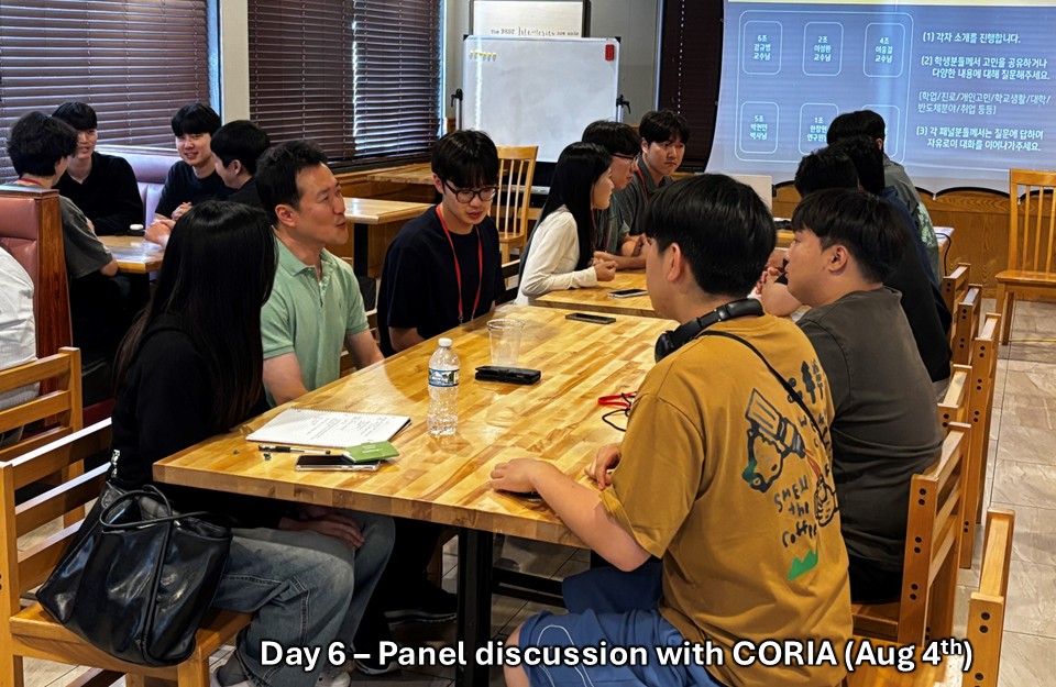 On Day 4, CORIA invited Dr. Woong-Sun Lee, CEO of SK hynix West Lafayette LLC, to give a seminar and engage with students over a networking meal. CORIA further arranged technical tours of Purdue’s BIRCK Nanotechnology Center, BIDC, and FLEX Lab to broaden students’ perspectives. On Day 6, CORIA hosted a panel discussion featuring leading Korean researchers at Purdue, including Prof. Sunghwan Lee, Prof. Kyubyung Kang, Prof. Woongkul Lee, Prof. Garam Kim, and researcher Changheon Han. These mentors, who had pursued research careers in the United States, shared valuable experiences and insights with students on academic and career pathways.