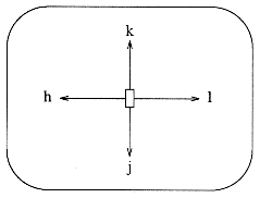 The most common means used to move the cursor is by use of "arrow" keys. Pressing an arrow key "\(ua" "\(da" "->" or "<-" will move the cursor one space in the direction indicated. If the terminal you are using does not have arrow keys, you can use the "direction" keys "h" (left), "j" (down), "k" (up), and "l" (right) to move the cursor one space on the screen. Pressing direction keys in command mode will move the cursor as indicated in the figure to the right. Watch out, many people mix up the lower-case "l" with the lower-case "i" or the numeral "1".