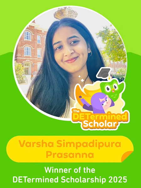 This fall, Varsha Simpadipura Prasanna began her journey in Purdue University’s Master of Engineering Management program — but her academic pursuit comes with a historic distinction. Varsha is the inaugural recipient of the DETermined Scholarship, a $30,000 award launched by the Duolingo English Test (DET) in collaboration with the Office of the Principal Scientific Adviser to the Government of India. The scholarship aims to empower young Indian women in STEM and support their ambitions to drive real-world change.