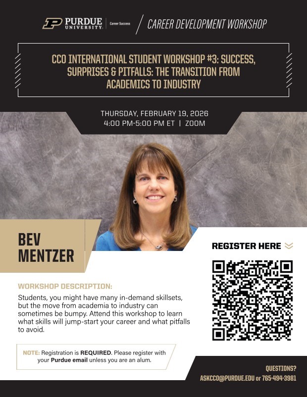 Bev Mentzer will discuss how you can avoid the bumps of transitioning from college to working in industry. Learn what in-demand skillsets can jump-start your career, and how to avoid pitfalls. See flyer for details and to register for this Zoom event on Thursday, Feb 19, 4-5PM ET.