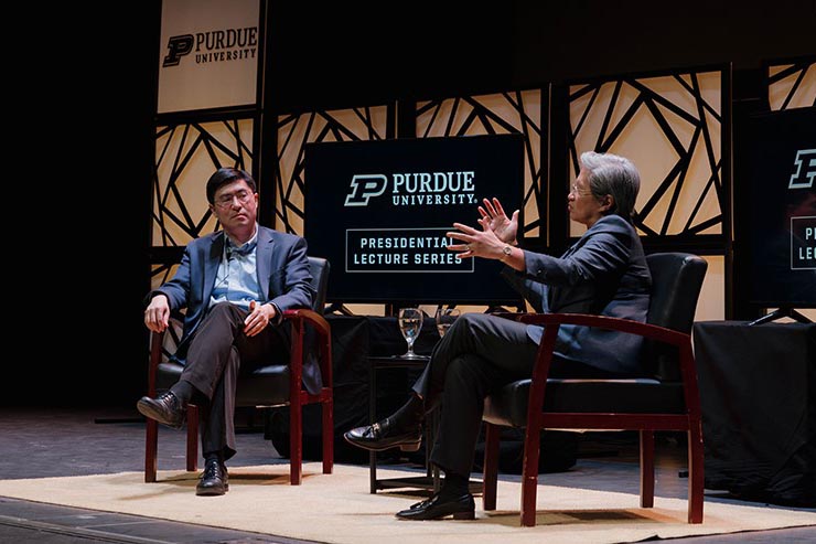 Influential global technology leader Lisa Su, the visionary CEO of semiconductor company AMD, joined Purdue University President Mung Chiang on March 2 for a Presidential Lecture Series event titled "Strategic Circuits: How University and Industry Partnerships Will Power the AI Era."