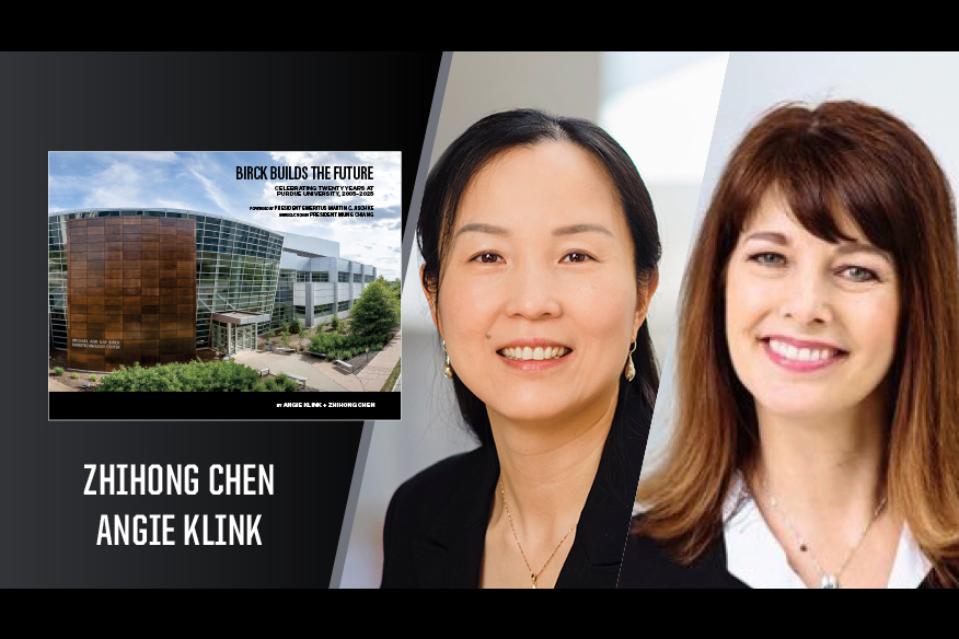 Zhihong Chen, a Reilly Professor of Electrical and Computer Engineering and the Mary Jo and Robert L. Kirk Director of the Birck Nanotechnology Center, and Angie Klink (BA communication ’81) and their published book “Birck Builds the Future: Celebrating Twenty Years at Purdue University, 2005-2025.”